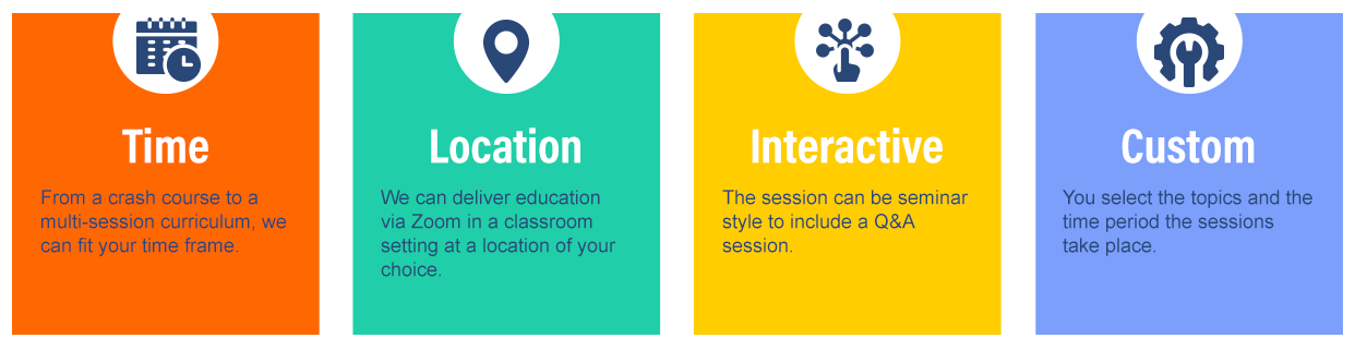 Whether you are an individual, a part of a group or a company with many employees, our classes can be personalized to your education needs.